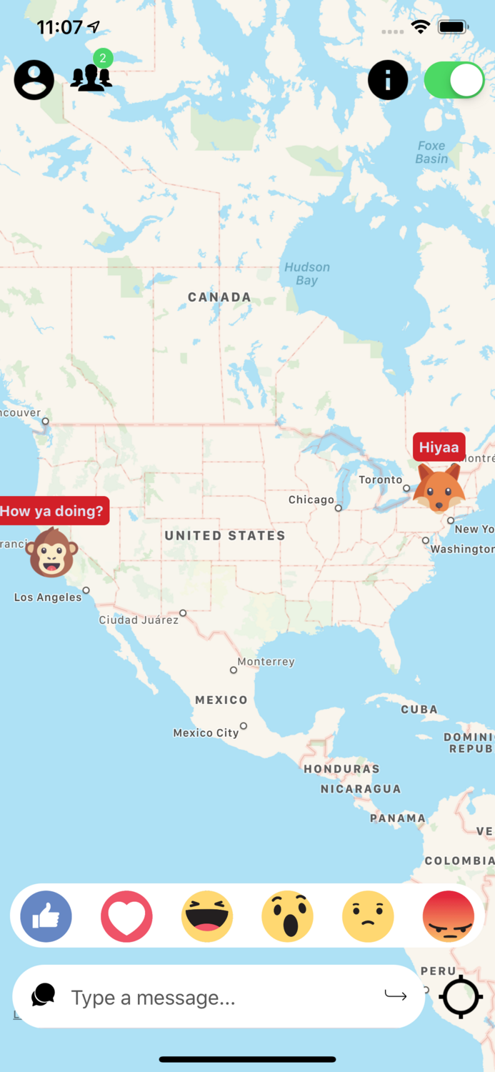 The main feature of PubMoji is to communicate how you are feeling to others. This wouldn't be possible without real-time geolocation updates, which are featured on PubMoji's map. It shows where users are located and tracks user movement as long as the app is open.